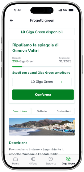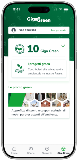 Scegli tu come essere very green: utilizza i tuoi Giga per sostenere progetti per la tutela ambientale nel nostro Paese o approfitta dei vantaggi di nostri partner attenti quanto noi al rispetto per l’ambiente. Scopri di più con il nostro video tutorial.